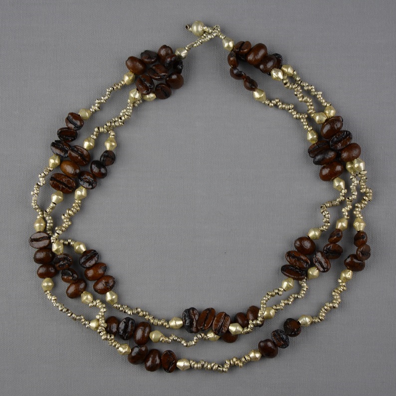 Collier plaqué argent en matériau recyclé, avec grains de café torréfiés et laqués, fait à la main et issu du